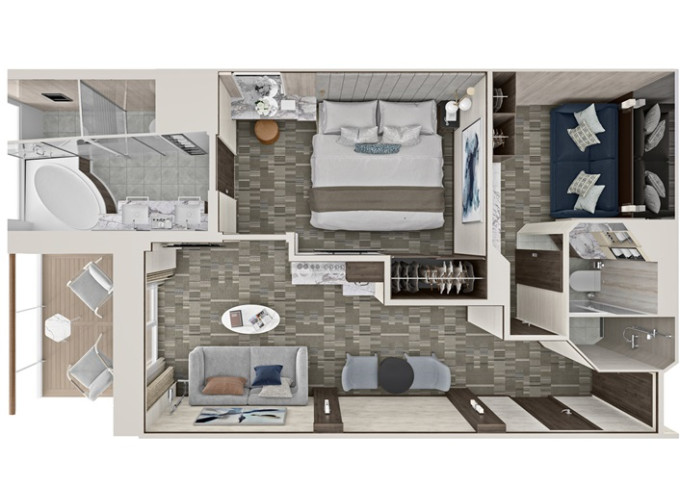 | H2 - The Haven Deluxe Owner's Suite 79 m² / balkón 11 m². 16,17. paluba - vpredu, stred. Max 4 osoby. Výhody The Haven. | 13 488 € 6 744 € za osobu |