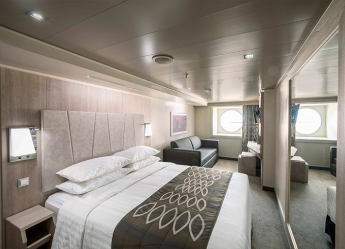 Vonkajšia kajuta s neotvárateľným oknom: 17 m², kajuta s manželskou posteľou (na požiadanie 2 oddelené postele) a 1-2 vyklápacie horné lôžka resp. rozťahovacia pohovka. Klimatizácia, kúpeľňa so sprchou a WC, toaletný stolík, skriňa, interaktívna TV, trezor, telefón, sušič vlasov, virtuálna asistentka ZOE, neotvárateľné okno. Kajuty v kategórii Bella a niektoré Junior a Deluxe majú obmedzený výhľad.