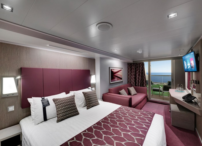 Balkónová kajuta: 16 -17 m², kajuta s manželskou posteľou (na požiadanie 2 oddelené postele) a rozkladacia pohovka. Klimatizácia, kúpeľňa so sprchou alebo vaňou a WC, toaletný stolík, priestranná skriňa, interaktívna TV, telefón, trezor, sušič vlasov, virtuálna asistentka ZOE. Balkóny so stolíkom a stoličkami. Niektoré kajuty majú obmedzený výhľad.
