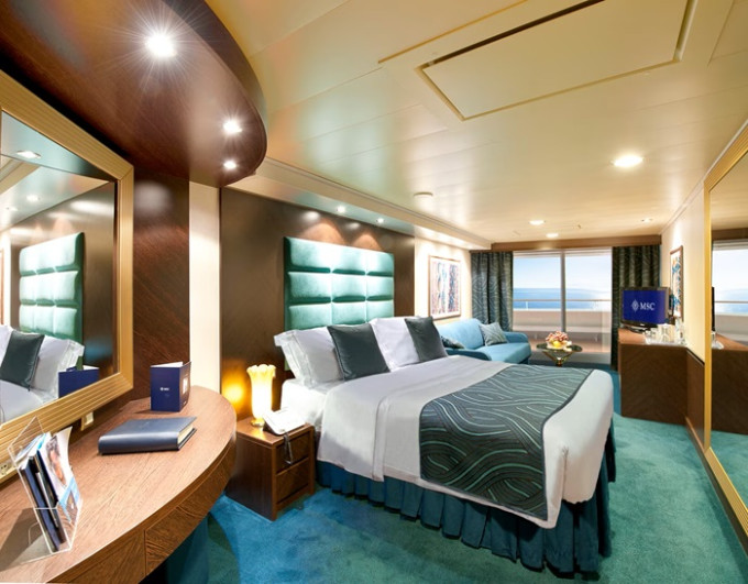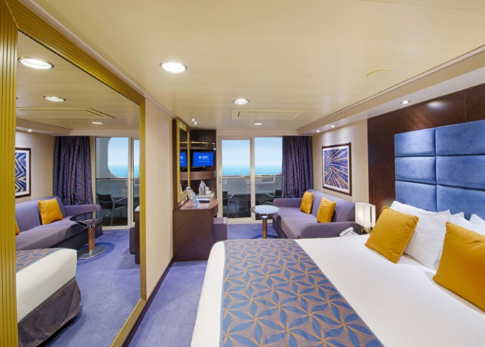 Suite s balkónom/panoramatickým oknom: 21-47m², kajuta s manželskou posteľou (na požiadanie 2 oddelené postele) a rozkladacia pohovka. Klimatizácia, kúpeľňa s vaňou, toaletný stolík, priestranná skriňa, interaktívna TV, telefón, minibar, sejf, sušič na vlasy. Balkón so stolíkom a stoličkami/panoramatické okno. Internetové pripojenie (za poplatok).