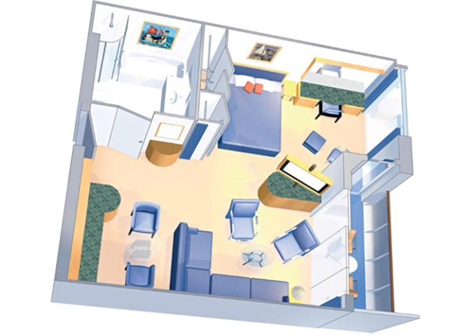 VP - Ocean View Panoramic Suite (bez balkónu) 38 m². Panoramatické neotvárateľné okná. 12. paluba. Max 6 osôb. Výhody Suite. 5 476 € 2 738 € za osobu