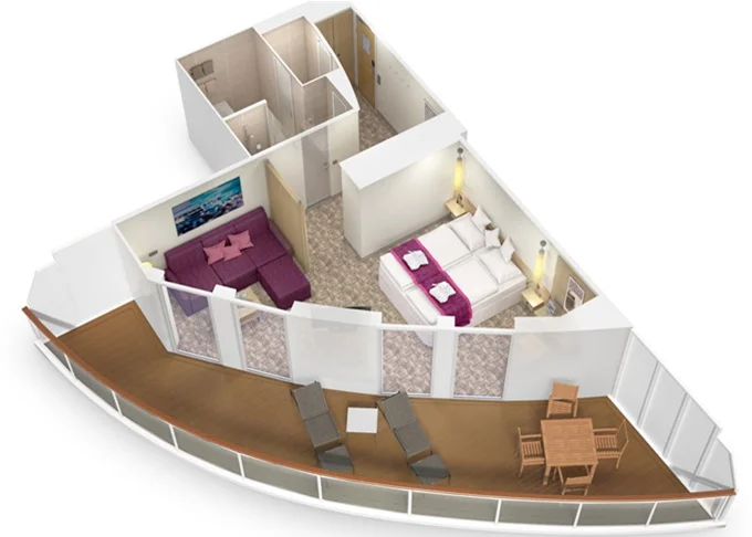 JA - Junior-Suite s balkónom PREMIUM 34 m² + terasa 27,5 m². 8. až 15. paluba. Max 4 osoby. Cenový model Premium + výhody Junior Suite. 10 610 € 5 305 € za osobu