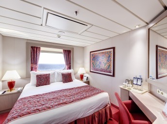 Suite s balkónom: cca 27m² kajuta s manželskou posteľou (na požiadanie 2 oddelené postele) a rozkladacia pohovka. Klimatizácia, kúpeľňa s vaňou, toaletný stolík, priestorná skriňa, TV, telefón, minibar, sejf, sušič na vlasy. Balkón so stolíkom a stoličkami. Internetové pripojenie (za poplatok).