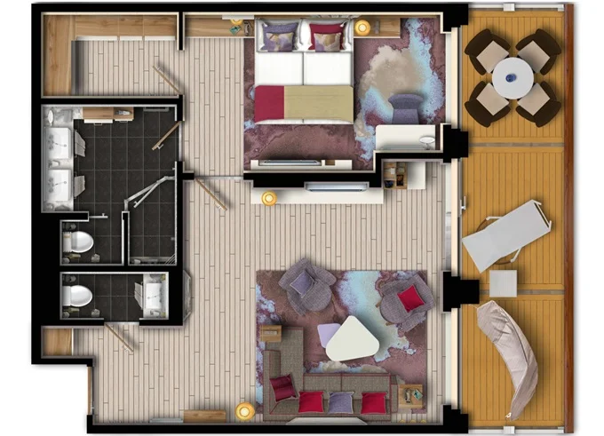 SKTO - Themen Suite 54 m² + balkón 15 m² so stolom, ležadlom a hojdacou sieťou. Spálňa, obývacia časť, šatník. 10. paluba. Max 4 osoby. Výhody Suite. 15 957 € 5 319 € za osobu